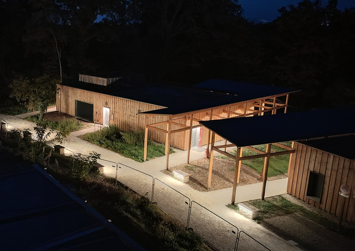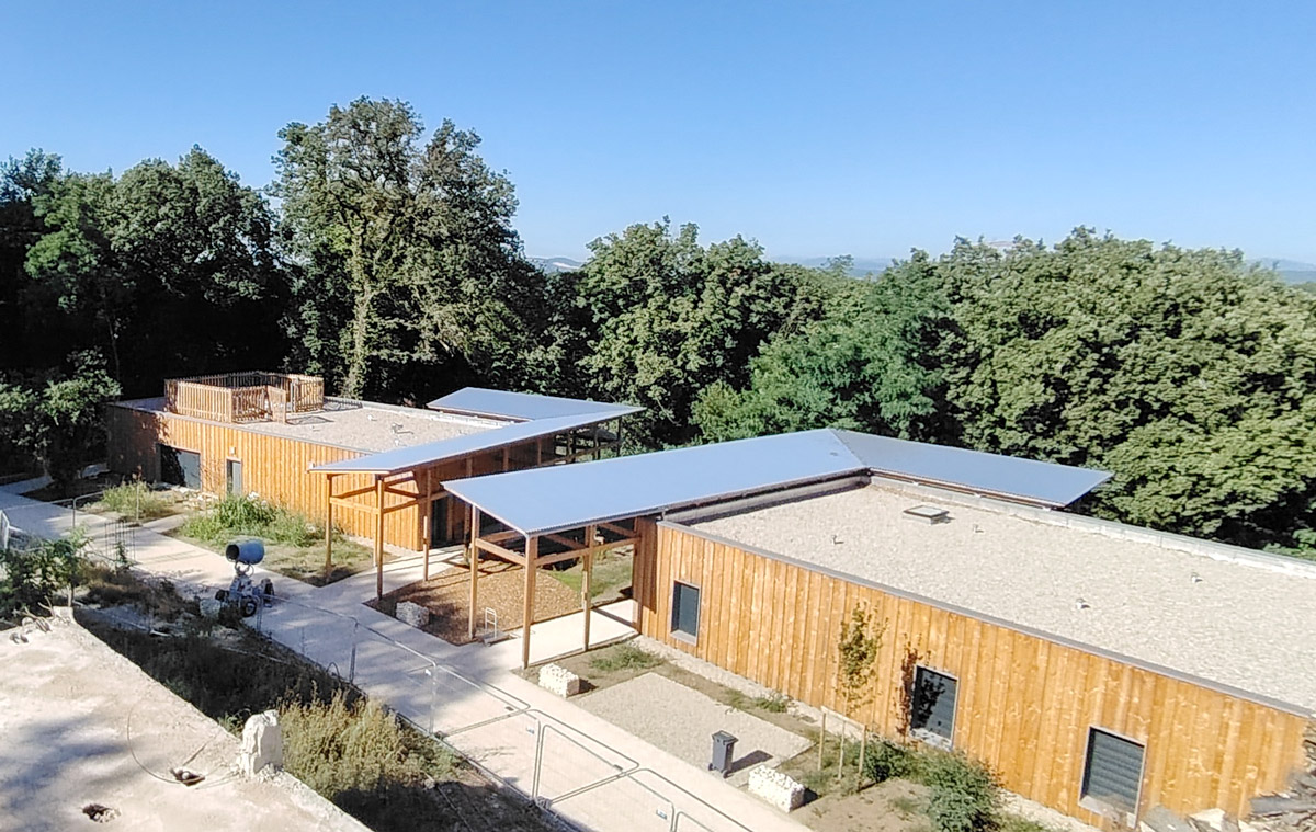 PF Bois Construction a également assuré la pose de 1 100 m² de bardage bois douglas sur les quatre bâtiments du site. Le bois provient de la scierie de Jastres, située en Ardèche, garantissant ainsi une filière courte et une mise en valeur des ressources locales.